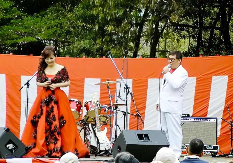 春の安芸のステージにて。満開のつつじとともに歌声を届けました